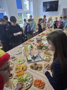 Po zakończeniu części artystycznej przyszedł czas na wspólne degustowanie przygotowanych potraw. Jedzenie zostało zorganizowane w formie szwedzkiego bufetu, dzięki czemu każdy mógł spróbować różnych przekąsek przygotowanych przez poszczególne klasy. Była to doskonała okazja do integracji, rozmów oraz wspólnego spędzenia czasu w miłej atmosferze.